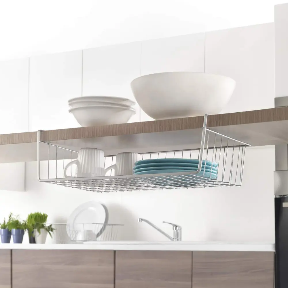 Esta cesta tipo canguro se adapta fácilmente a la parte inferior de los estantes o dentro de los armarios, creando espacio adicional de almacenamiento sin necesidad de herramientas, mientras que su estructura resistente y su diseño versátil la convierten en un accesorio ideal para organizar la cocina, el baño o el armario, optimizando el espacio.