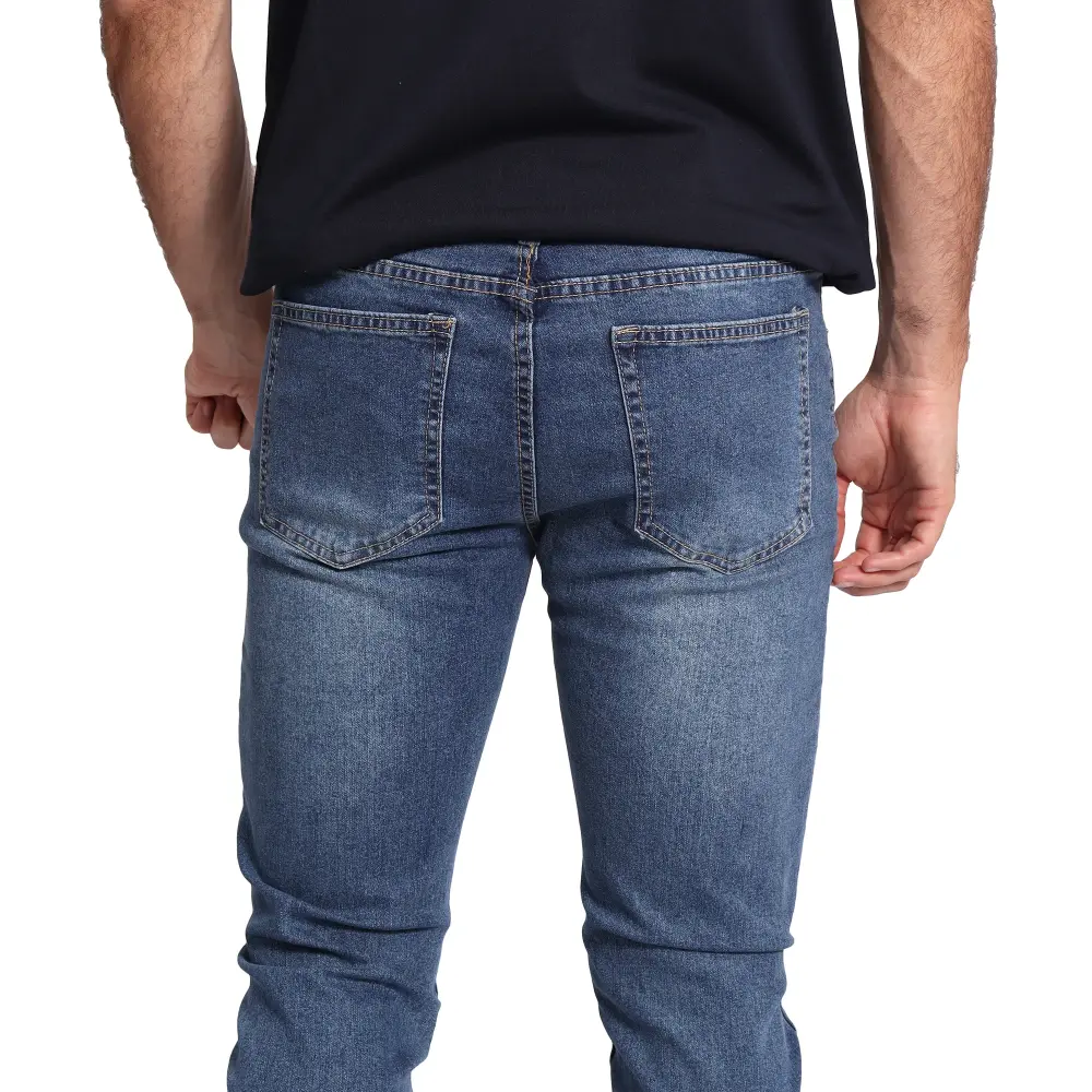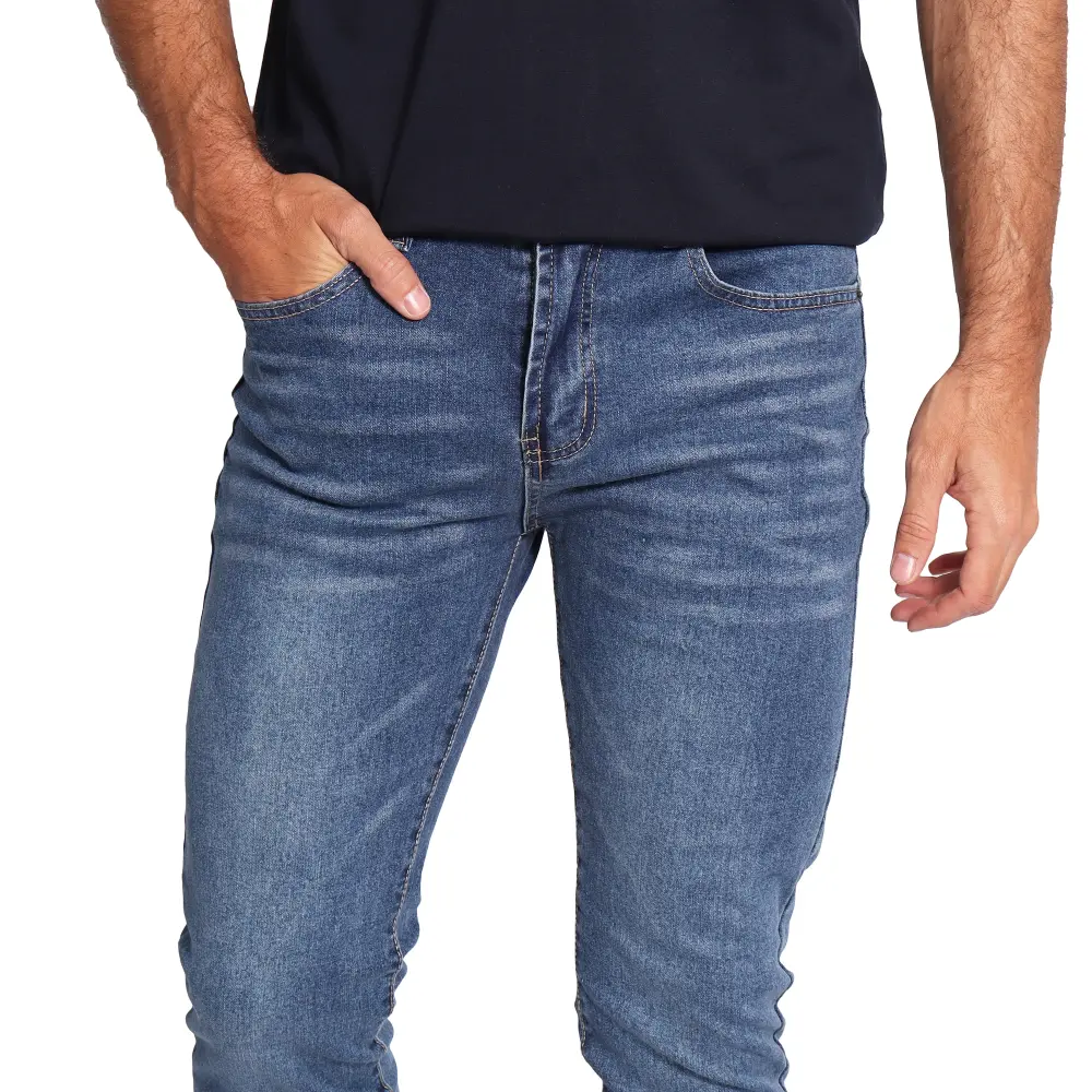 Con un diseño moderno y ajustado, este jean presenta un cierre frontal de botón y cremallera. Su tejido denim incorpora un acabado ligeramente texturizado con sutiles efectos de desgaste, mientras que el corte slim fit se adapta cómodamente a la silueta desde la cadera hasta el tobillo. Ideal para combinar con franelas casuales o camisas más formales.